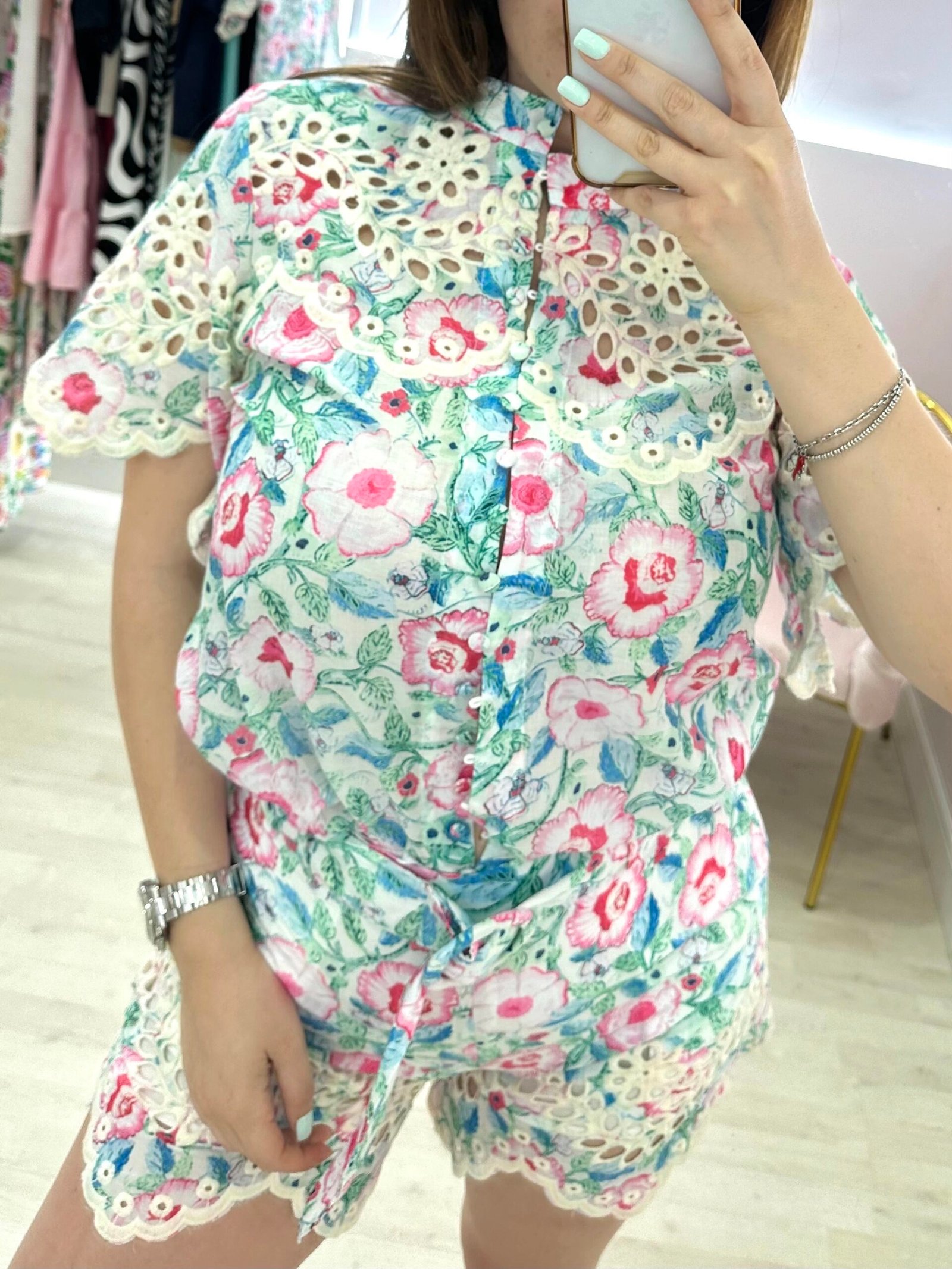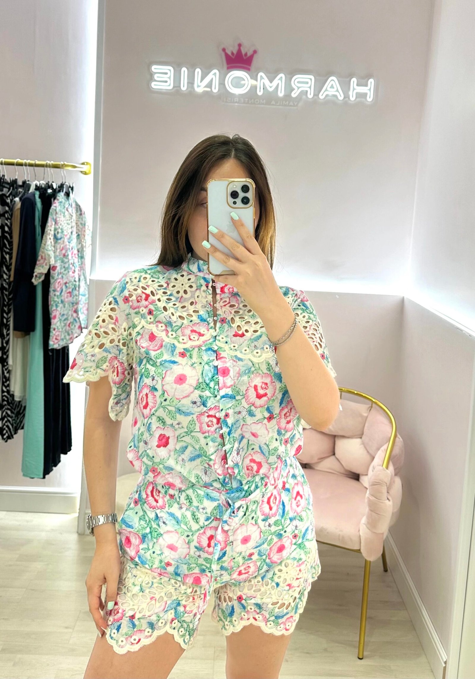 Coordinato in cotone, con ricami in pizzo, zip laterale